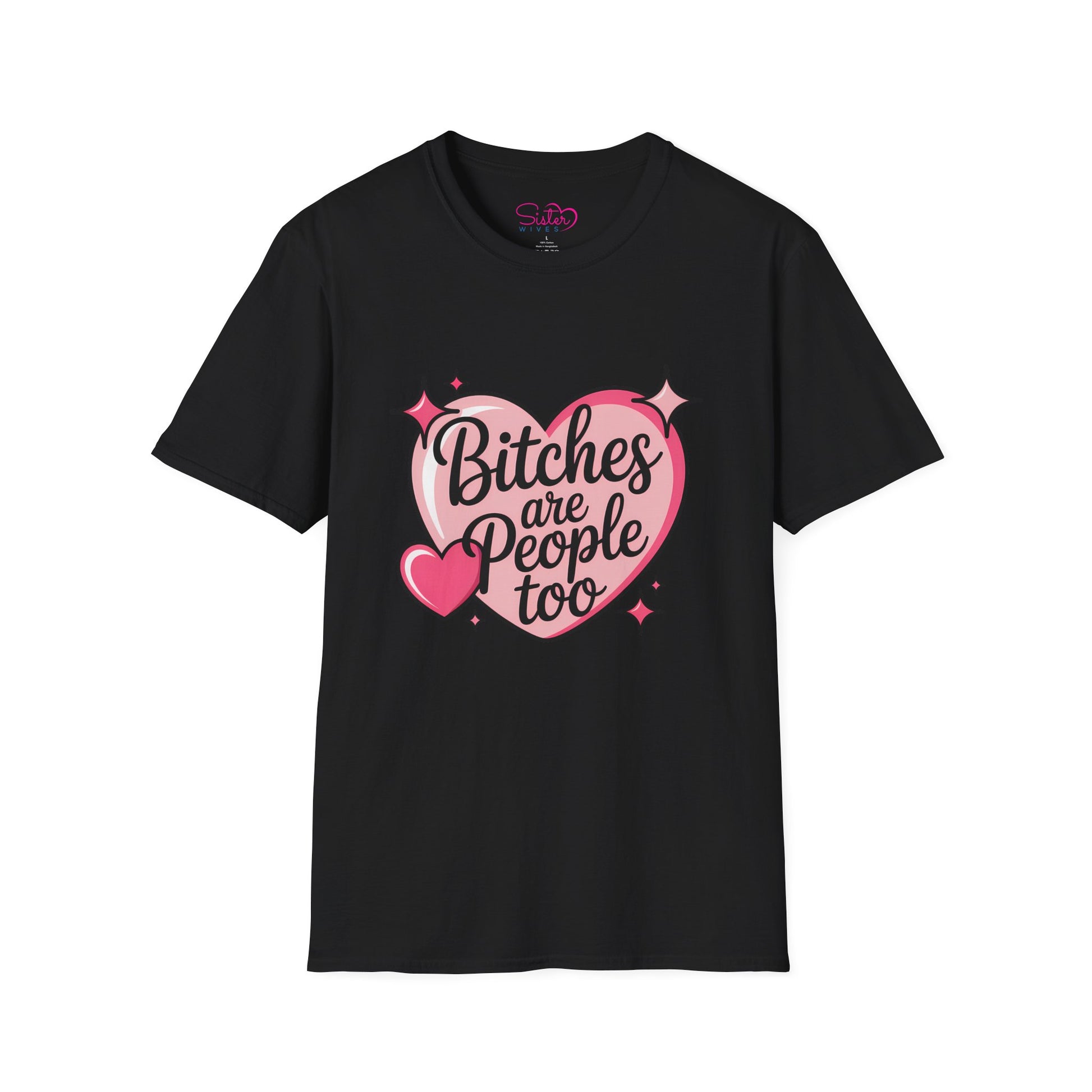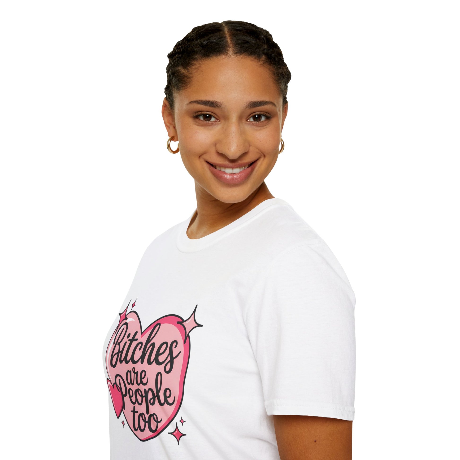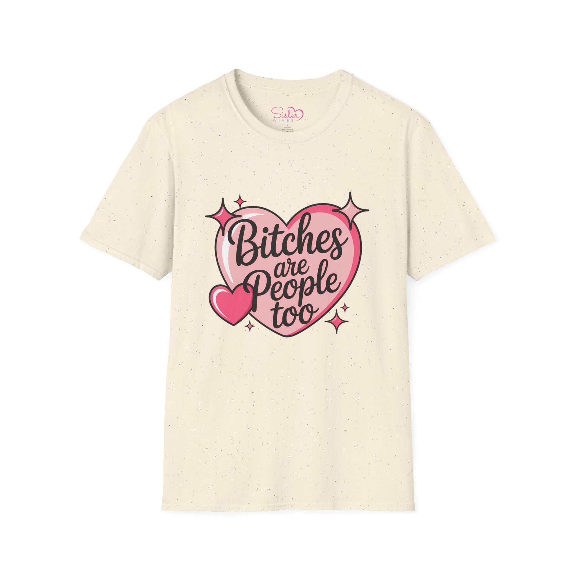 The “Bitches Are People Too” t-shirt pairs a soft pink heart design with a bold, empowering message that celebrates autonomy, respect, and reclaiming language. It’s playful on the outside—but powerful at its core.