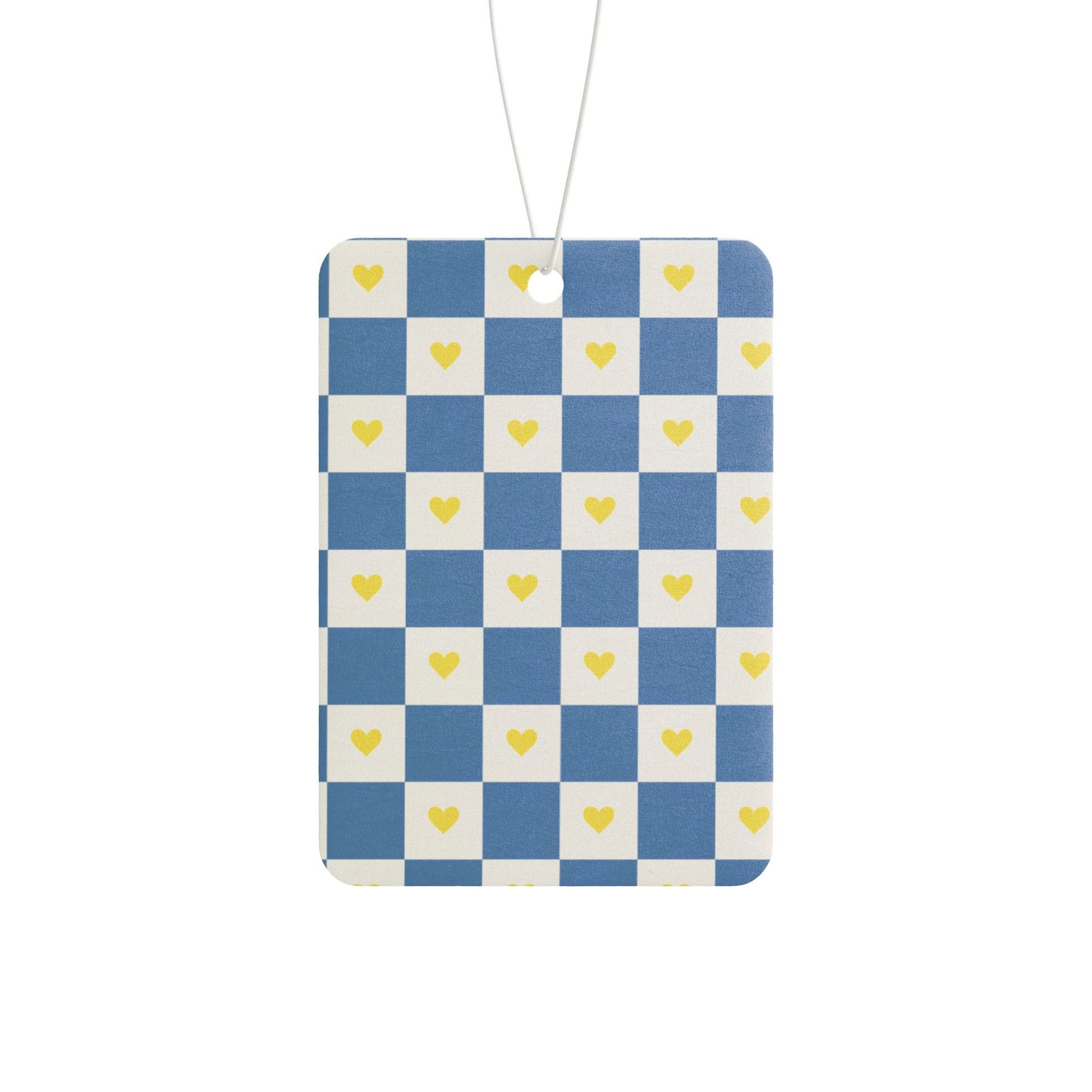 This blue checkered heart car air freshener adds a soft, preppy touch to your car interior while keeping it smelling fresh and clean. Featuring a blue-and-cream checkerboard pattern accented with tiny yellow hearts printed on both sides, this hanging air freshener is perfect for fans of preppy aesthetics, coastal vibes, cute decor, and soft everyday style.