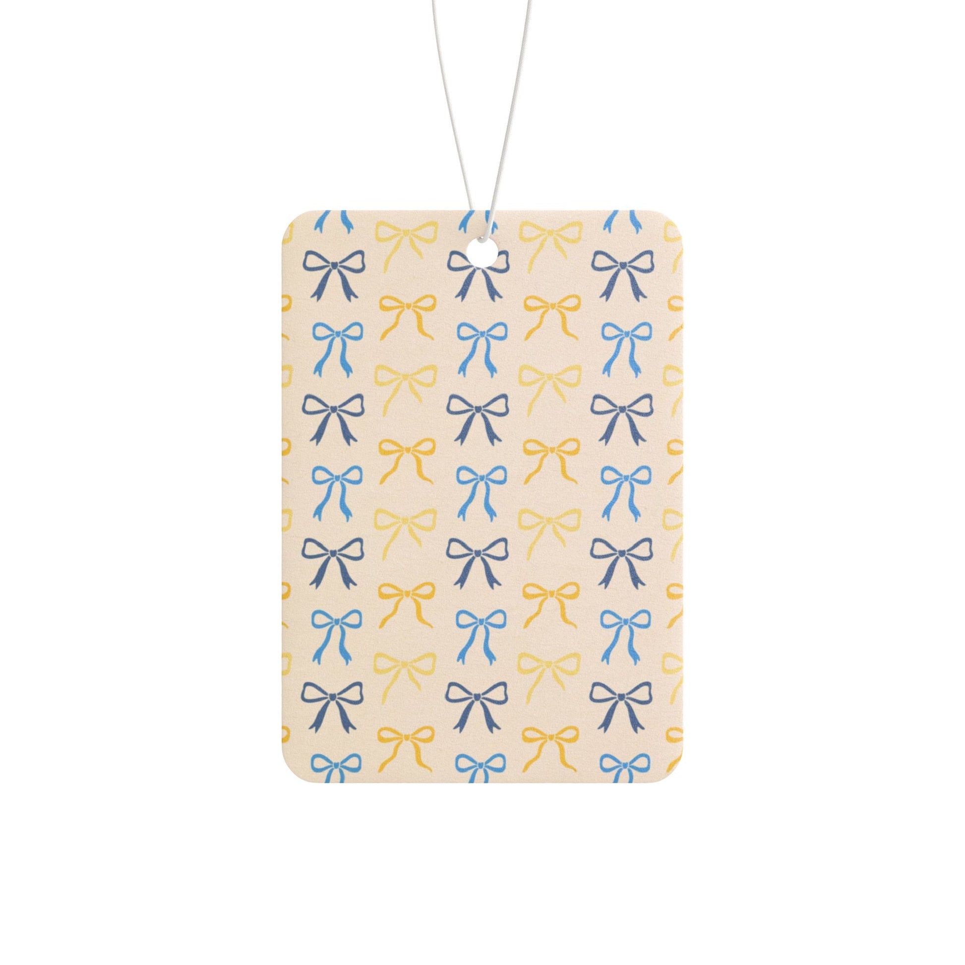 This bow aesthetic car air freshener adds a soft coquette touch to your car while delivering a clean, long-lasting fragrance. Featuring an all-over bow pattern in neutral tones printed on both sides, this hanging air freshener is perfect for lovers of bowcore style, coquette aesthetics, soft girl vibes, and minimal feminine decor.