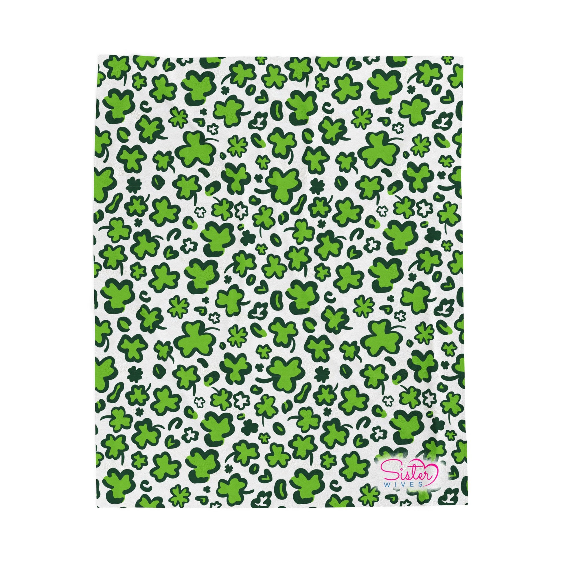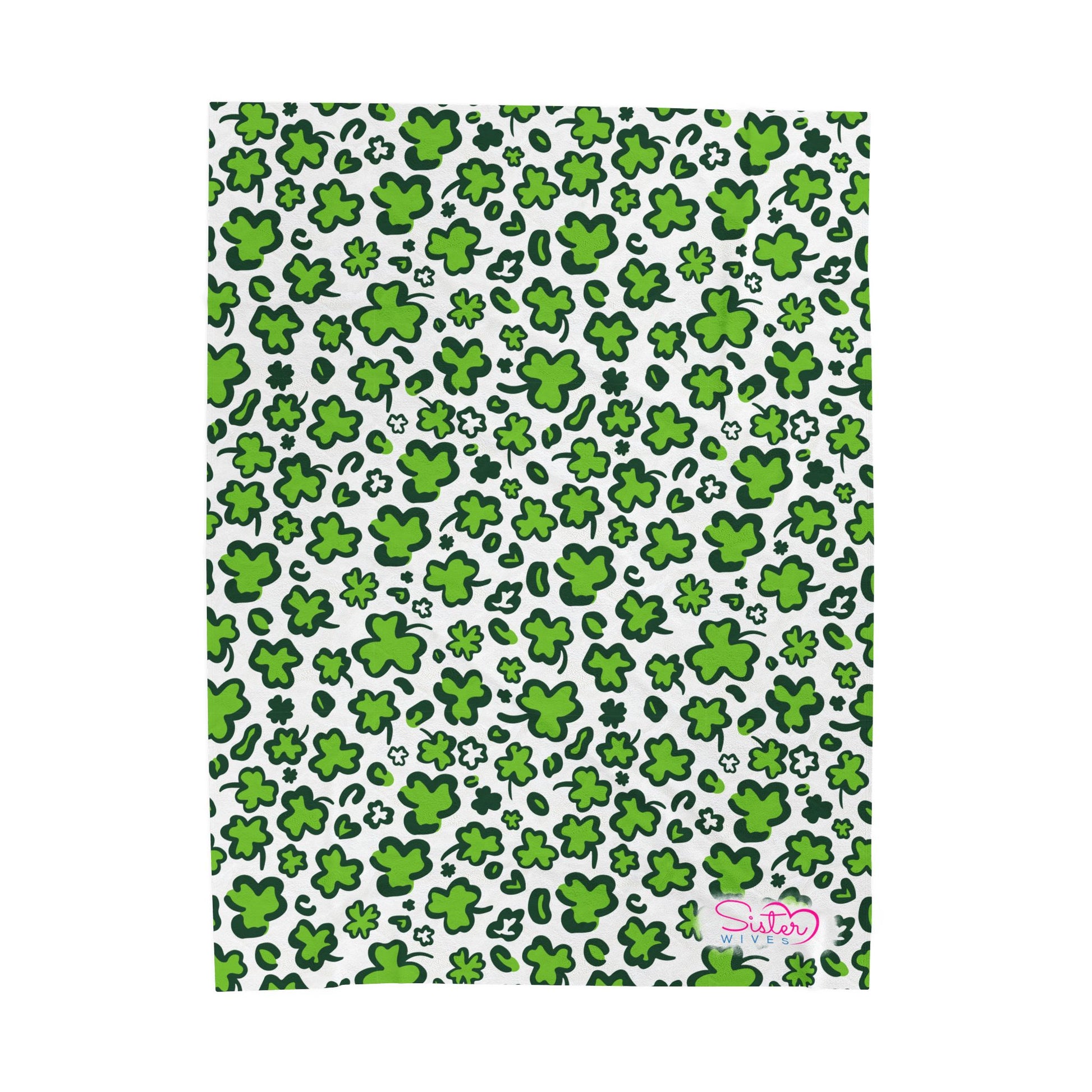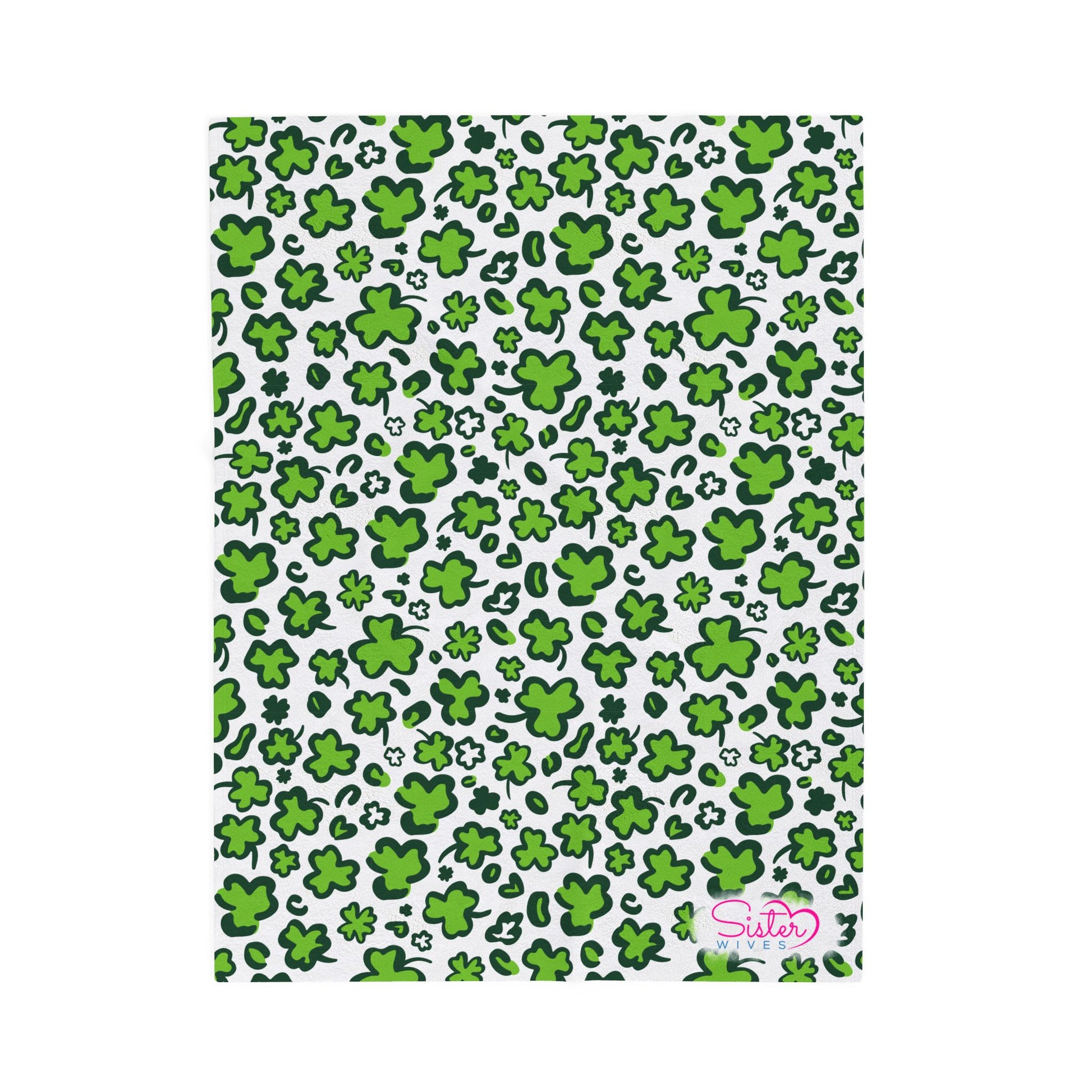 Wrap yourself (and your favorite people) in comfort with this playful green shamrock throw blanket, designed for cozy nights, shared spaces, and homes built on love in all its forms. Featuring an all-over clover pattern in vibrant green on a soft white background, this blanket brings cheerful charm, warmth, and personality to any bedroom, couch, or cuddle pile.