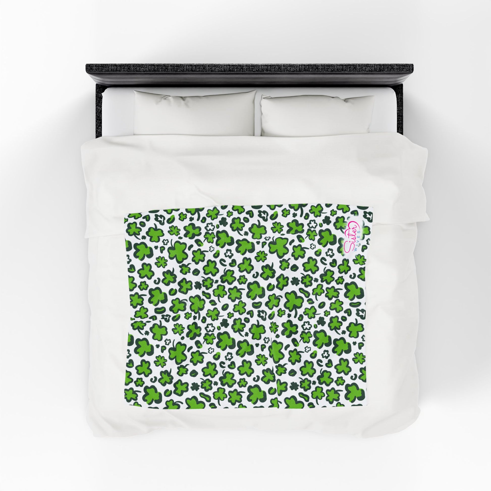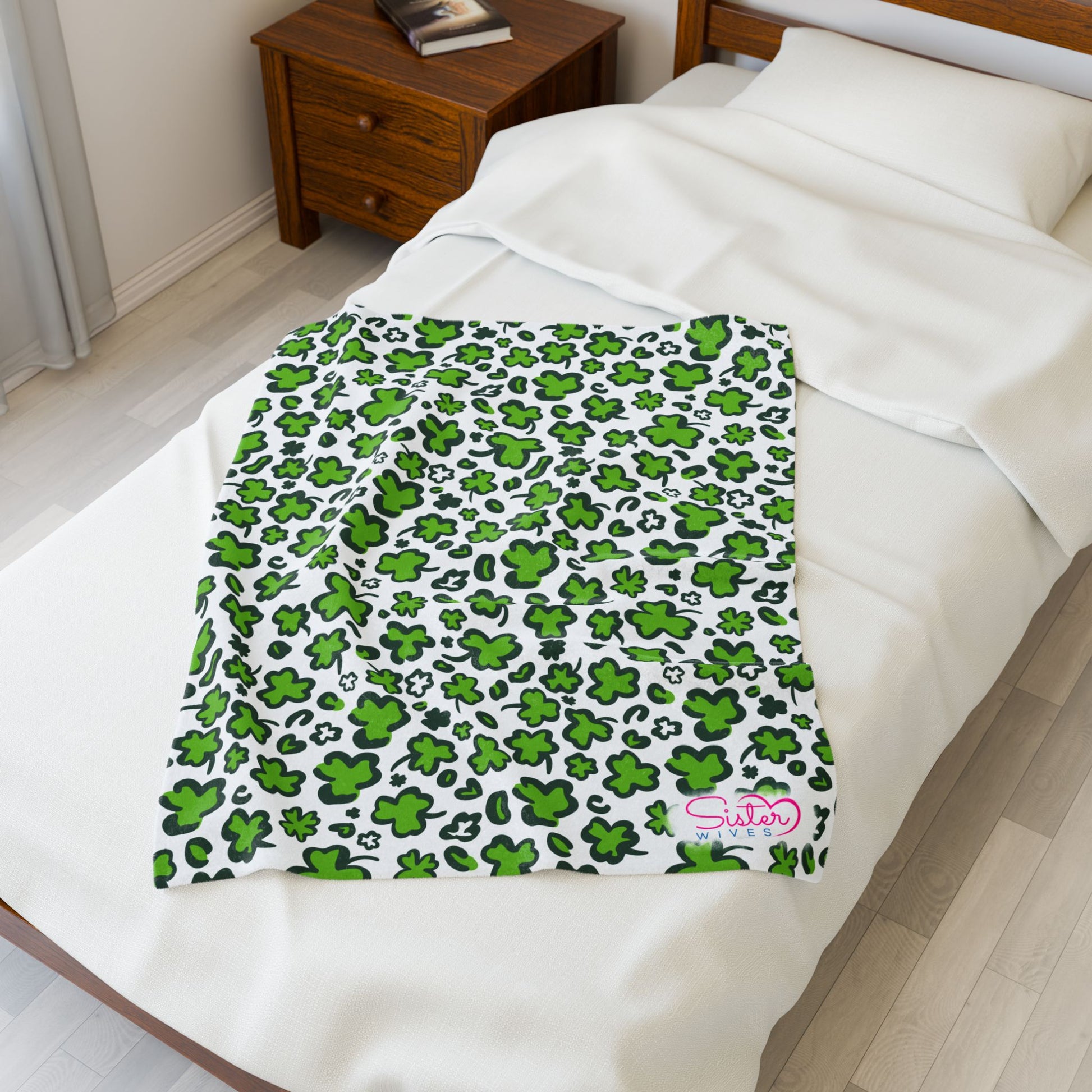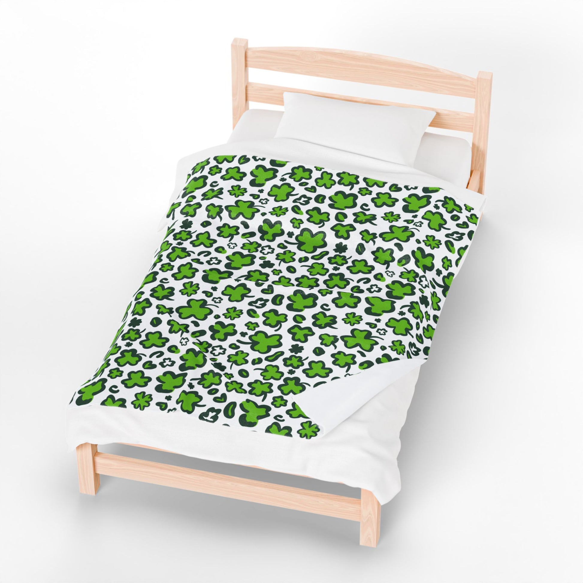Wrap yourself (and your favorite people) in comfort with this playful green shamrock throw blanket, designed for cozy nights, shared spaces, and homes built on love in all its forms. Featuring an all-over clover pattern in vibrant green on a soft white background, this blanket brings cheerful charm, warmth, and personality to any bedroom, couch, or cuddle pile.