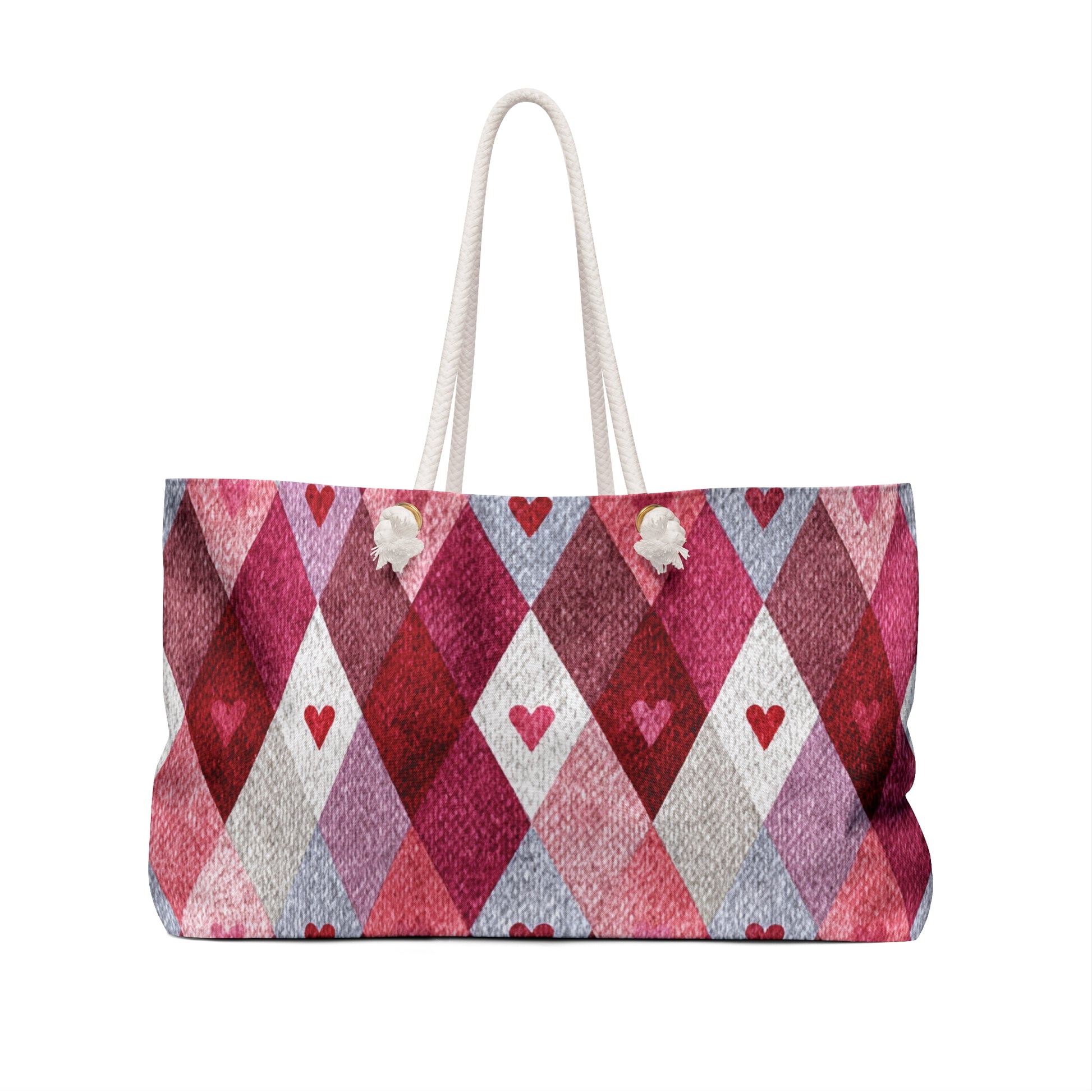 Valentine Red & Pink Weekender Bag | Romantic Heart & Checkered Patterns | Polyamory-Friendly Travel Bag | Cute Getaway Tote for Couples & Throuples